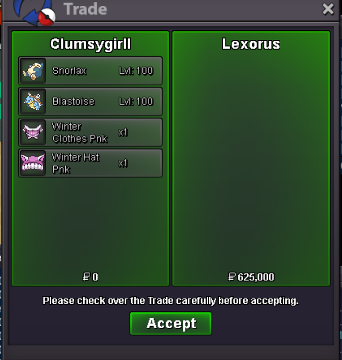 Important Reminders This is a Gold Server auction. You may bid from any server but you must transfer to Gold Server upon winning the auction. If you intend to purchase with an alternate account or from other server, please specify the account name and/or server name alongside your bid. 15 minutes rule is applied. (If a bid is received in the final 15 minutes of the auction, the end point will be delayed by 15 minutes from that bid, and will be delayed by 15 minutes for each new bid thereafter, until the current offer has been held for a full 15 minutes) Please check the Trade Rules and Auction Rules if you are new to trading in PRO Auction Details Start Price: 10k End Point: 48 Hours (after start) Insta Price: None Minimum Raise: 5k Accepted Payments: Pokedollars,C C=500k,RerollTicket=700kServer Name: gold