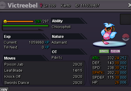 Hello there! I'd like to sell this pvp ready pink Victreebell S.o: 400k Minimum raise: 50k Insta: 2,5m Auction ends 72 hours after s.o is met Accepted payments: pokedollars, cc (500k) and rerolls (750k)