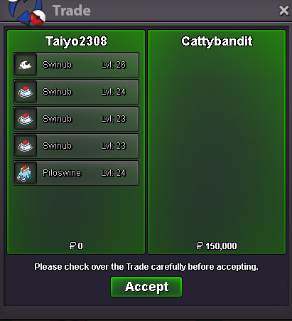 auction pvp ready pokes : 1) Rotom timid 31 speed : S.o : 600k - minimum bid :100k - auction end 3 days after first bid 2) Greninja timid 31 speed : S.o : 400k - minimum bid :100k - auction end 3 days after first bid 3)clodsire : def/spdef/atk/hp +21 S.o : 600k - minimum bid :100k - auction end 3 days after first bid 4) Aurorus : Ice tank ( Stealth rock-freeze-dry-ancient power-earth power) S.o : 400k - minimum bid :100k - auction end 3 days after first bid 5) ferrothorn : def/spdef/atk/hp +20 (Movesets ready : toxic spikes - toxic - recover - earthquake) S.o : 400k - minimum bid :100k - auction end 3 days after first bid paymenet : - money - reroll ticket = 750k each - coin capsules = 500k