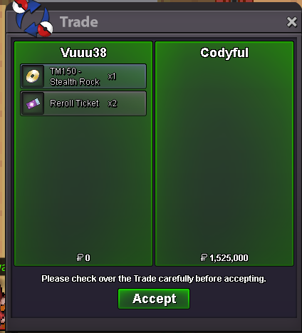 Alt account: Sumocal (Silver Server) Auction Details: Start Price: 5m End Point: 8 days (after start price is met) Insta Price: N/A Minimum Raise: 200k Accepted Payments: Pokedollars, Coin Capsules (x1 Coin Capsule = 500k), IV Reroll Tickets (x1 IV Reroll Ticket = 750k) Important Reminders: This is a Silver Server auction. If bidding from an alternative server, state that you will transfer upon winning. If you intend to purchase with an alt account, specify the account alongside your bid. If a bid is received in the final 15 minutes of the auction, the end point will be delayed by 15 minutes from that bid, and will be delayed by 15 minutes for each new bid thereafter, until the current offer has been held for a full 15 minutes. Happy Bidding!