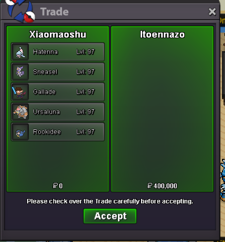 Auction Details: Start Price: 1.5m End Point: 36 hours (after start price is met) Insta Price: N/A Minimum Raise: 100k Accepted Payments: Pokedollars, Coin Capsules (x1 Coin Capsule = 500k), IV Reroll Tickets (x1 IV Reroll Ticket = 700k) Important Reminders: If you intend to purchase with an alt account, specify the account alongside your bid. If a bid is received in the final 15 minutes of the auction, the end point will be delayed by 15 minutes from that bid, and will be delayed by 15 minutes for each new bid thereafter, until the current offer has been held for a full 15 minutes. Happy Bidding!