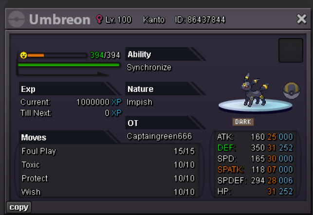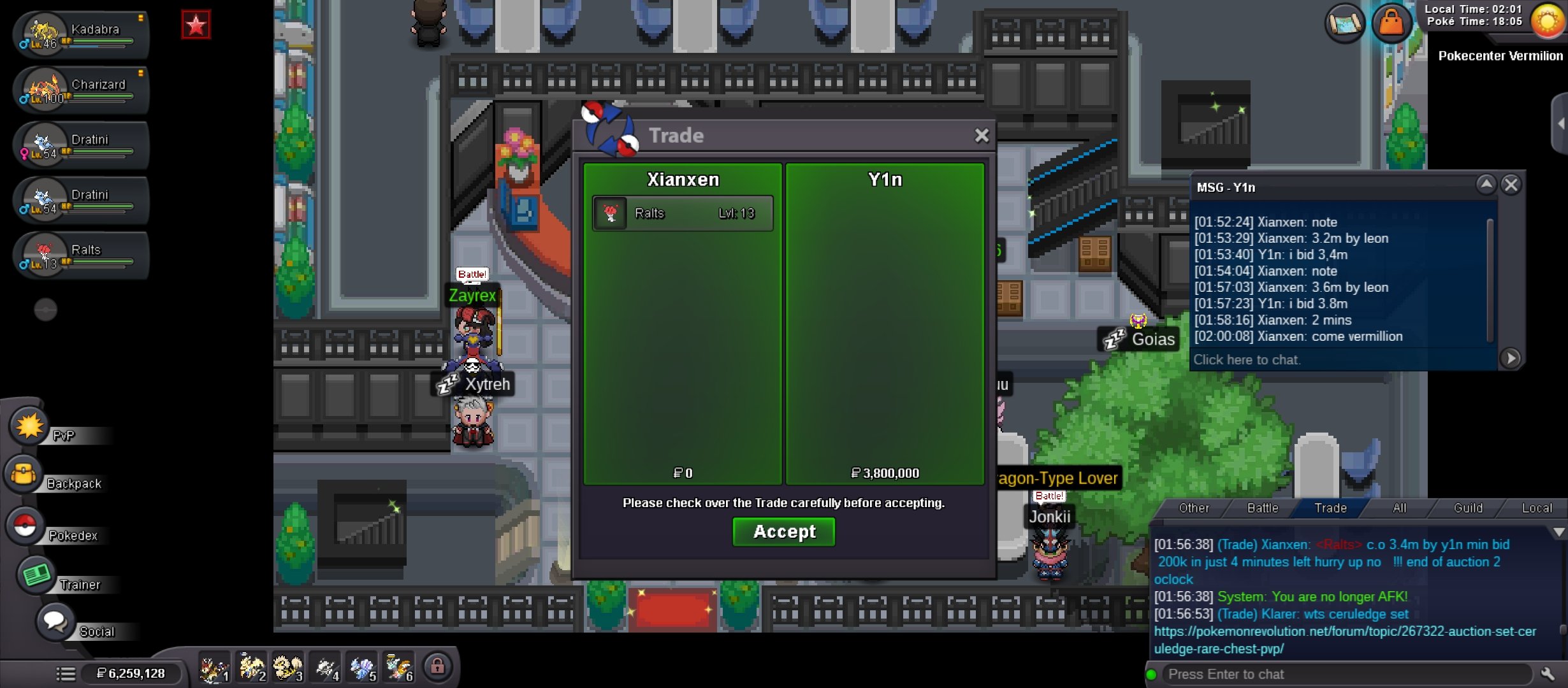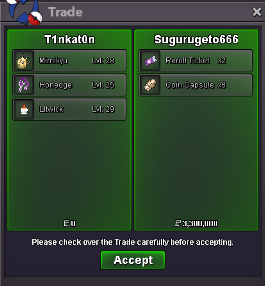 Auction Details: Start Price: 4m End Point: 48 hours (after start price is met) Insta Price: N/A Minimum Raise: 100k Accepted Payments: Pokedollars, Coin Capsules (x1 Coin Capsule = 500k), IV Reroll Tickets (x1 IV Reroll Ticket = 750k) If a bid is received in the final 15 minutes of the auction, the end point will be delayed by 15 minutes from that bid, and will be delayed by 15 minutes for each new bid thereafter, until the current offer has been held for a full 15 minutes.