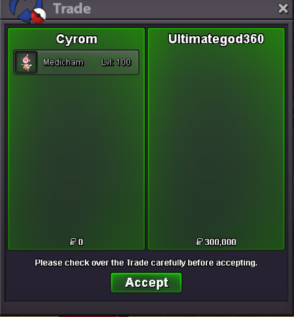 Starting price: 300k Min bid: 200k No Insta END 48 HOURS AFTER FIRST BID ALL AUCTION RULES APPLIES (INCLUDING 15 MIN RULE) You can bid from gold but have to transfer if you won ACCEPTED PAYMENTS Coin Capsule: 450k Pokedollars Nature Reroll: 300k IV Reroll: 650k