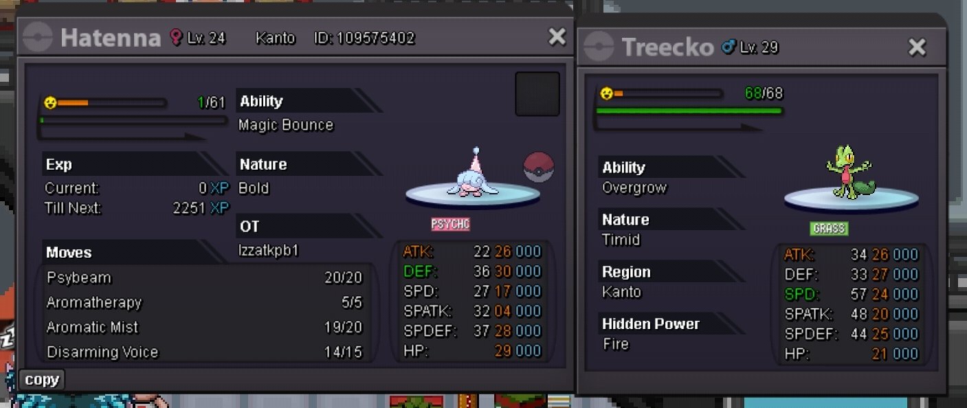 Hello everyone, time to sell my Hatenna Star Offer ---> 350K Min offer ---> 50K Insta ---> N/A Endpoint ---> 24 Hours after 1st bid Accepted payments: Pokedollars CCs ---> 500K IVs Rerolls ---> 700K Important info, this pokemon is in my alt account (Komata) in GOLD SERVER.