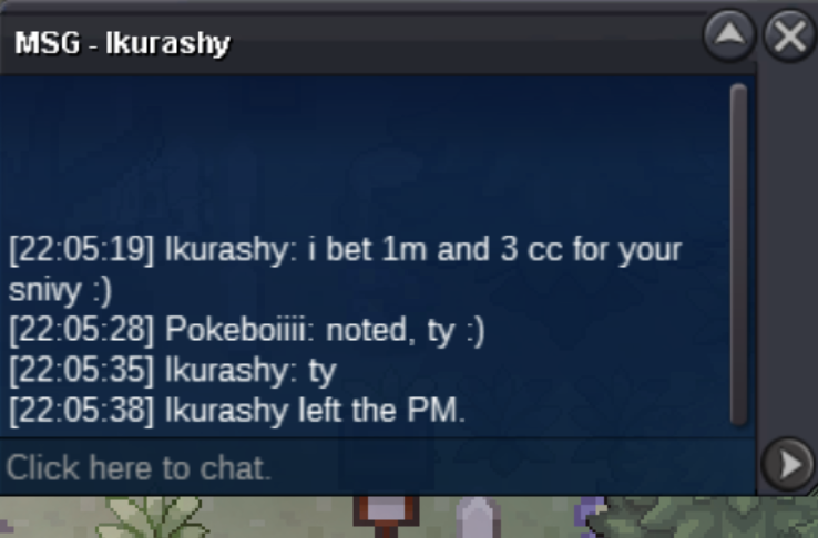 7. Alt account: Auctioneer (Gold Server) Auction Details: Start Price: 5m End Point: 40 hours (after start price is met) Insta Price: N/A Minimum Raise: 100k Accepted Payments: Pokedollars, Coin Capsules (x1 Coin Capsule = 500k) Important Reminders: This is a Cross Server auction. You may bid from any server, and I will transfer to your preferred server upon winning. If you intend to purchase with an alt account, specify the account alongside your bid. If a bid is received in the final 15 minutes of the auction, the end point will be delayed by 15 minutes from that bid, and will be delayed by 15 minutes for each new bid thereafter, until the current offer has been held for a full 15 minutes. Happy Bidding!