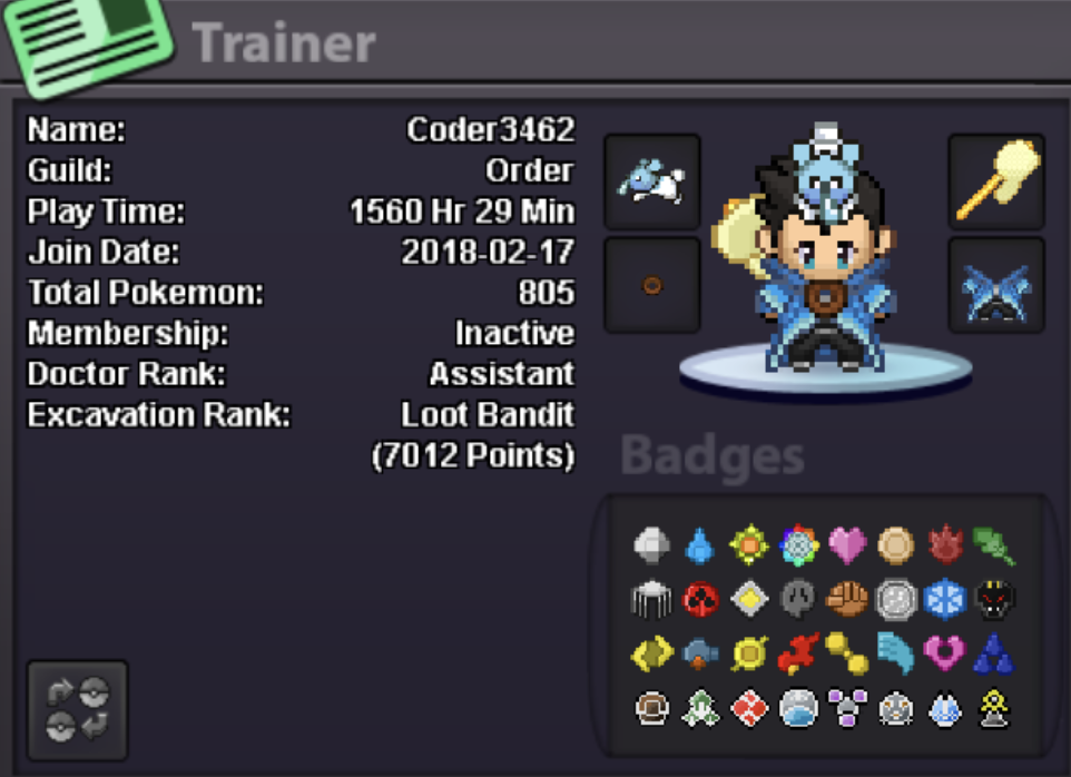 ° what can you contribute to Eternity? My main contribution would be pvp -- i have honestly not done a lot in PRO in that regard but i have been a top randbats player on pokemon showdown and try to have 10+ of every TM, multiple of every item, and most uncommon pokes for dex service -- all of which i can help newbies to the guild (or anyone really) with. I also have almost every mega stone, legendary, and have done most quests and can help with not only how to do them but also have stuff that results from unlocking them. Also have a boss team ready and do all of them every week so i have pokedollars as well as thousands of PVE coins ° what is your real life and ingame name? RLN: Rahul and IGN: coder3462 ° how old are you and where are you from? 23 years old and I'm in NYC USA. ° discord tag? how often are you online there rsha256 and I check discord whenever pinged (usually once a hr but varies) and once a day otherwise ° screenshot of your trainercard -