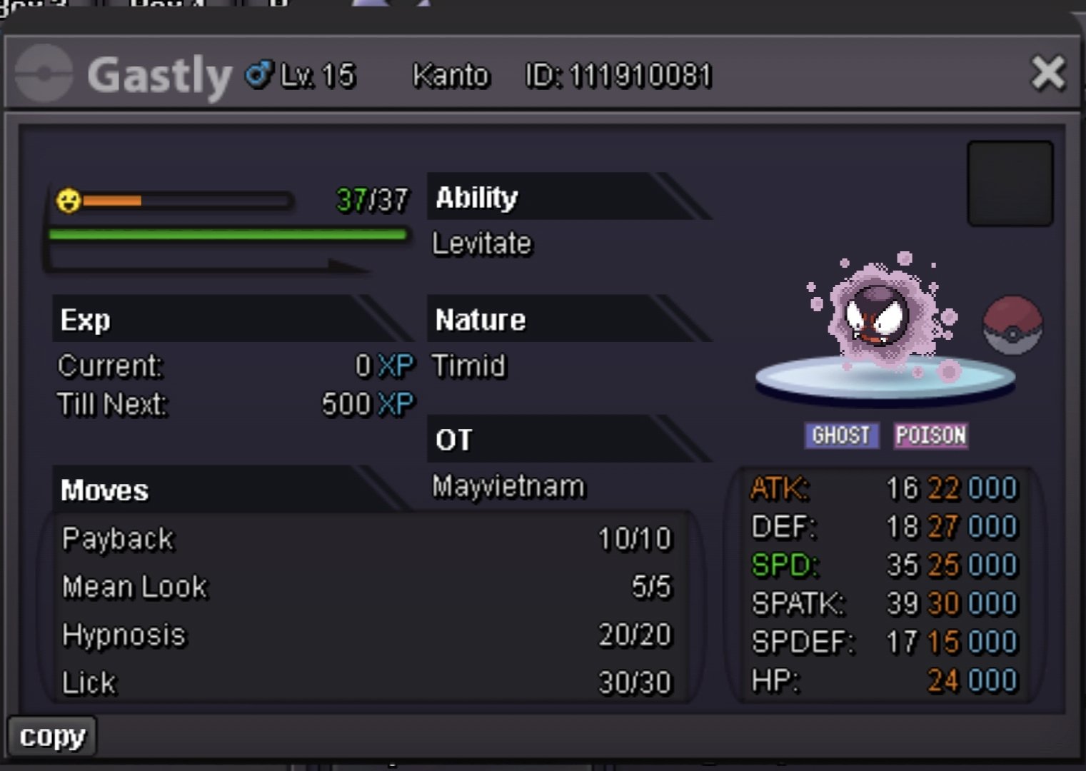 WTS Gastly Timid 30/25 SpAtk/Spd - Epic Stats! Starting Point/Price: 220k End Point: 48h after first bid Min. Raise: 30k No Insta