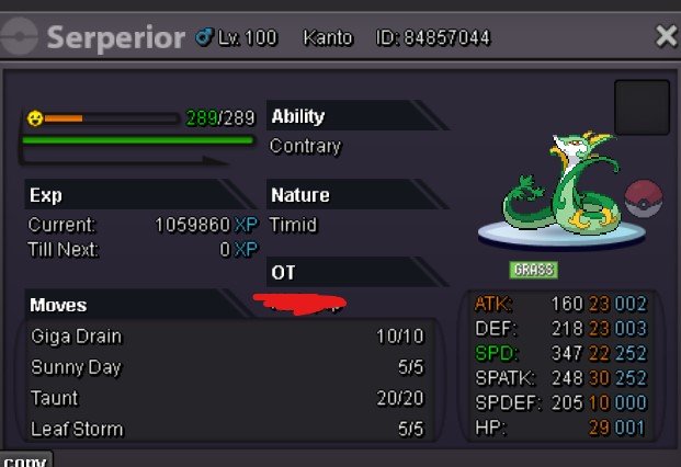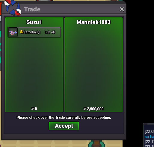 4. Auction Details Start Price: 100k End Point: 24 Hours (after start) Insta Price: 2.5m Minimum Raise: 50K Accepted Payments: Pokedollars / cc = 500k each Server Name: gold Important Reminders This is a Gold Server auction. You may bid from any server but you must transfer to Gold Server upon winning the auction. If you intend to purchase with an alternate account or from other server, please specify the account name and/or server name alongside your bid. 15 minutes rule is applied. (If a bid is received in the final 15 minutes of the auction, the end point will be delayed by 15 minutes from that bid, and will be delayed by 15 minutes for each new bid thereafter, until the current offer has been held for a full 15 minutes) Please check the Trade Rules and Auction Rules if you are new to trading in PRO