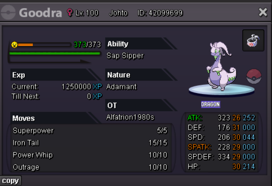 Start Price: 100k End Point: 24 hours (after start price is met) Insta Price: 1m Minimum Raise: 100k Accepted Payments: Pokedollars, Coin Capsules (x1 Coin Capsule = 500k), IV Reroll Tickets = x1 IV Reroll Ticket = 700k) Important Reminders: This is a Silver Server auction. If bidding from an alternative server, state that you will transfer upon winning. If a bid is received in the final 15 minutes of the auction, the end point will be delayed by 15 minutes from that bid, and will be delayed by 15 minutes for each new bid thereafter, until the current offer has been held for a full 15 minutes.