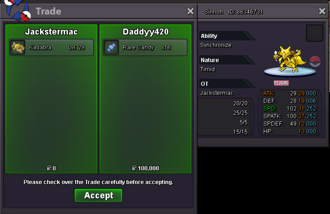 Start Price: 2m5 End Point: 48 hours after the start price is met No Insta Minimum Raise: 100k Accepted Payments: Pokedollars Coin Capsules (1 CC = 480k) IV Reroll Tickets (1 IV Reroll = 700k) Apply rule: 15 minutes