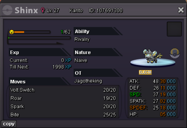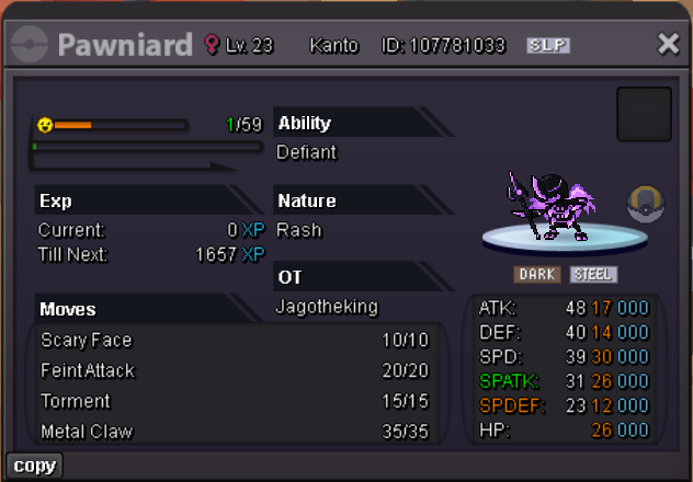 Auction Details: Start Price: 3M by Psyren End Point: 48 hours (after start bid) Insta Price: N/A Minimum Raise: 100k Accepted Payments: Pokedollars Other Infos: I prefer for you to bid here directly, I might not be in game for long tomorrow and the day after.. GOOD LUCK TO ALL OF YOU GUYS !!!