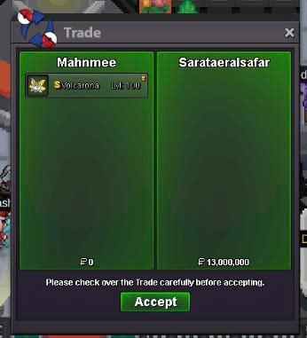 Start Price: 100k End Point: 48 hours (after start price is met) Minimum Raise: 100k Accepted Payments: Pokedollars, Coin Capsules (x1 Coin Capsule = 500k), IV Reroll Tickets (x1 IV Reroll Ticket = 700k) Important Reminders: This is a Cross Server auction. You may bid from any server, and I will transfer to your preferred server upon winning. If a bid is received in the final 15 minutes of the auction, the end point will be delayed by 15 minutes from that bid, and will be delayed by 15 minutes for each new bid thereafter, until the current offer has been held for a full 15 minutes.
