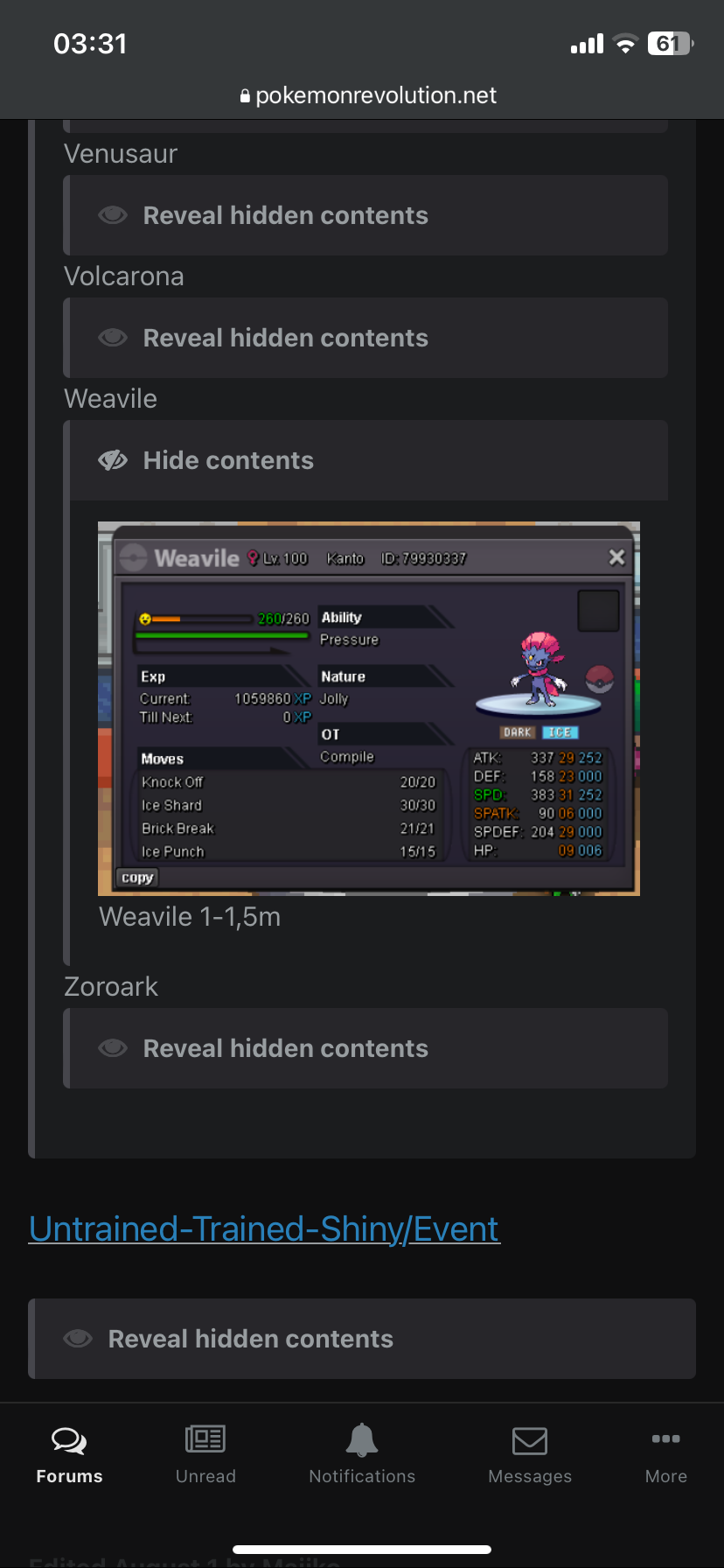 Starting Price : 1m Min. Bid : 200K No Insta Accepted Payments : CC (450k), IV rerolls (600k), Pokedollars Time Duration : 48 Hours, after the starting price is met. As a reminder concerning Auction Rules : This is a Silver Server auction. If you are on Gold, you will have to transfer to SIlver upon winning. Please include the account name you will be using for the transaction if you are not purchasing with your main account. 15 minute forum auction rule : If a bid is received in the final 15 minutes of the auction, the end point will be delayed by 15 minutes from that bid, and will be delayed by 15 minutes for each new bid thereafter, until the current offer has been held for a full 15 minutes.