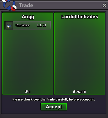 Details: Start Price : 500k Min Bid: 100k Insta: n/a End point: 48 hours after initial bid Accepted Payment: Pokedollars, Coin Capsules (x1 Coin Capsule = 500k) This is a silver Server auction. You may bid from any server but you must transfer to silver Server upon winning the auction. You may place bids here or in game. The 15 Minute rule will go into effect if a bid is placed in the last 15 minutes
