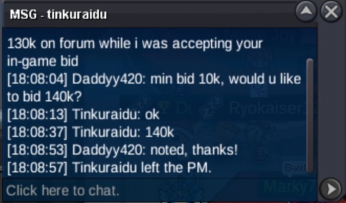 AUCTION RED SUSANO Auction Details End Point: 48 hours each poke (after 1st bid) Specting offer 16m Insta Price: 20m Minimum Raise: 200k Accepted Payments: Pokedollars, Coin Capsules (x1 Coin Capsule = 500k), IV Reroll Tickets (x1 IV Reroll Ticket = 700k) If you intend to purchase with an alt account, specify the account alongside your bid. This is a gold auction if u are from silver you need to transfer.