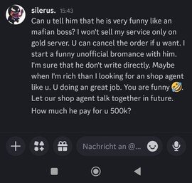Im sorry if you know him. I find out his Intentions. He want that you sell your Region/Story Service only on GoldServer. His Agent ask for 4 Acc than he cancel 3 Acc. Than He want 1 Acc only Gold Server. His Agent contact him and waiting for the confirmation. He Pay his Agent the FullStoryService and gives him not sure like 500k reward for his Job. If you know him well than im sorry for posting something you already know. My Message to his Agent: