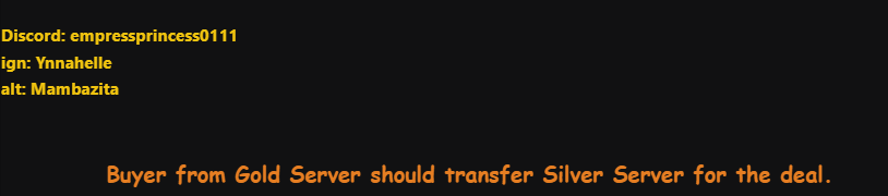 Hello @Ynnahelle, Just for clarification, as this shop is on Pokémon Shops - Gold, you should sell and have these pokemons on the Gold Server. Players from Silver Server will need to transfer if they want to trade with you. I have just deleted this statement on your Shop rules to avoid any confusion. Best regards, Hizukii