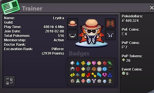 1. What's your Player name (IGN)? Lrydra 2. Number of hours played? 488 3. What's your favorite Pokemon? Rayquaza 4. What do you enjoy doing the most in PRO? (Hunting, Dungeons, PvP, trading, etc) Hunting and Dungeons/Bosses and a bit of PVP 5. Screenshot of your Trainer Card