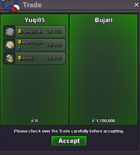 Start Price: 100k End Point: 24 hours (after start price is met) Insta Price: 1,5m Minimum Raise: 100k Accepted Payments: Pokedollars, Coin Capsules (x1 Coin Capsule = 500k), IV Reroll Tickets = x1 IV Reroll Ticket = 700k) Important Reminders: This is a Silver Server auction. If bidding from an alternative server, state that you will transfer upon winning. If a bid is received in the final 15 minutes of the auction, the end point will be delayed by 15 minutes from that bid, and will be delayed by 15 minutes for each new bid thereafter, until the current offer has been held for a full 15 minutes.