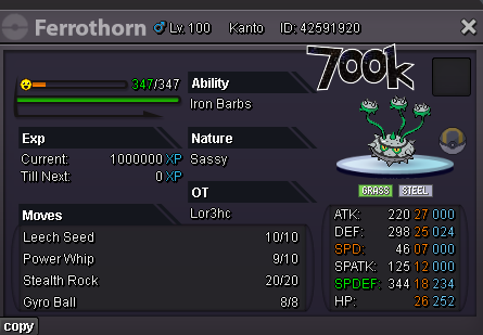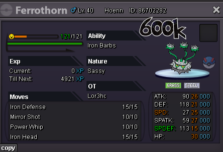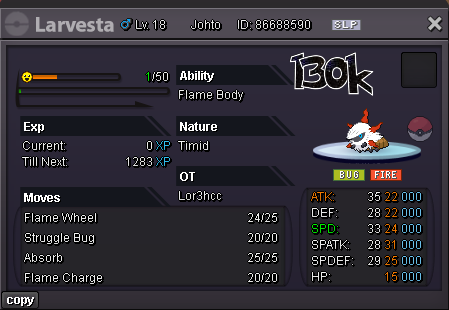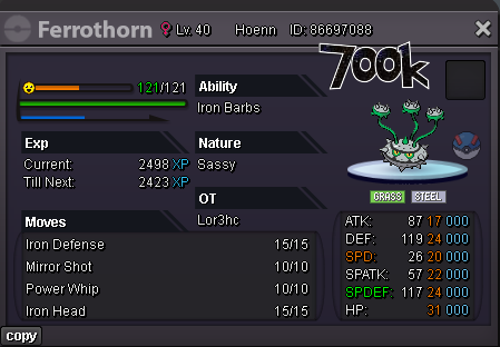 Daily new mons (19/11) On list • Cutiefly (Timid/Shield Dust) • Ferrothorn (Sassy-Careful/Iron Barbs) • Larvesta (Timid/Flame Body) Fully Trained • Garchomp (Jolly/Sand Veil) • Ferrothorn (Sassy/Iron Barbs) • Charizard (Jolly/Blaze) • Slowbro (Sassy/Regenerator) Cosmetics