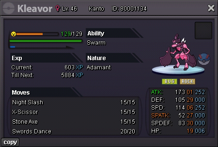 Accepted payments Pokedollars Coin capsules: 450k IV reroll tickets: 650k This is not a bundle auction Pink Kleavor Starting price: 3m Minimum raise: 100k Instant price: 6m Time: 48 hours after start Pink Scizor Starting price: 3m Minimum raise: 100k Instant price: 6m Time: 48 hours after start Important Information This is a Gold Server auction. However, you may bid from any server, but you will need to transfer to Gold Server upon winning. If you intend to purchase with an alt account, specify the account alongside your bid. If a bid is received in the final 15 minutes of the auction, the end point will be delayed by 15 minutes from that bid, and will be delayed by 15 minutes for each new bid thereafter, until the current offer has been held for a full 15 minutes. Incase a trade mod needs to force-trade, the Pokémons are in @Krubsiu account.