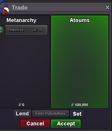 Start price: 3m End point: 24 hours (after start price is met) Minimum Raise: 100k Accepted Payments: Pokedollars, Coin Capsules (500k)