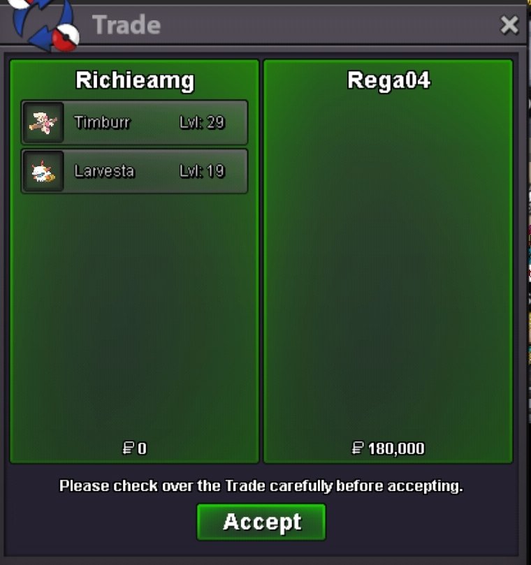 Hi, the outcome for all the trades has been forced. Houdinipro won the blace with a bid of 1.55m @Mtmazhab007You have received the charmander and 250k has been deducted from your balance. @G4rminYou received the heracross and 550k has been deducted from your balance. @Spa8as21You received the dratini and 2.5m has been deducted from your balance. @VaerisaYou received the skrelp and 100k has been deducted from your balance. Best of luck -Opacity -