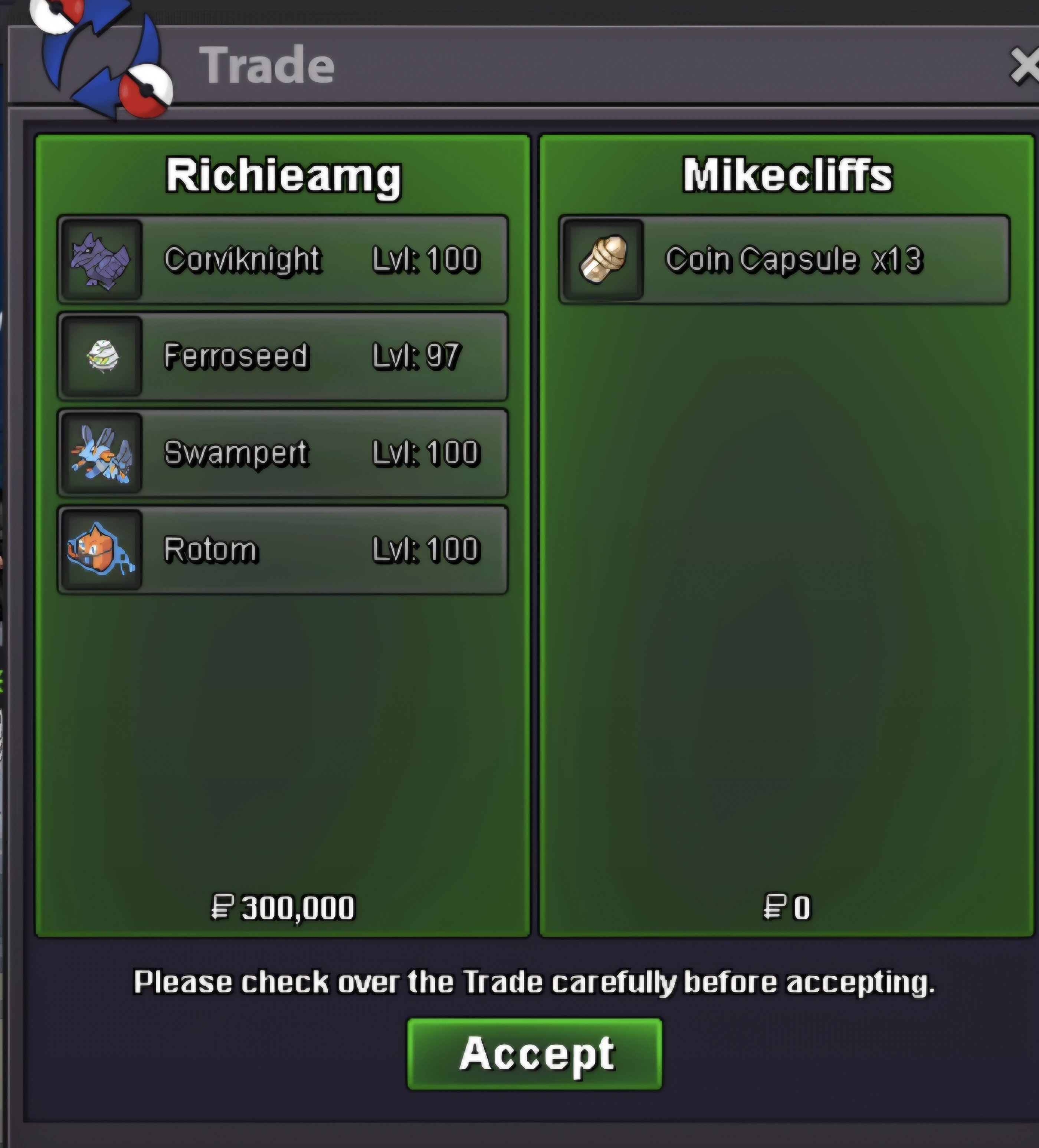 bundle auction Trainer tower ready Lv39 Lv69 Lv100 Fullset. (Moxie 22+ Gyarados) *Please note that at levels 39 and 69, you’ll need to use an alt account to lend it to your main account. Start : 150k min : 50k insta/ Auction : 24h after first bid (15min Auction rule) Accepted Payments: Pokedollars, Coin Capsules (x1 Coin Capsule = 500k), IV Reroll Tickets (x1 IV Reroll Ticket = 750k)
