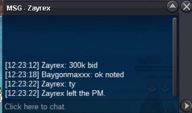 Auction Details: Start Price: 4m5 End Point: 48 hours (after start price is met) Insta Price: 6m Minimum Raise: 200k Accepted Payments: Pokedollars, Coin Capsules (x1 Coin Capsule = 500k), IV Reroll Tickets (x1 IV Reroll Ticket = 750k) Important Reminders: If you intend to purchase with an alt account, specify the account alongside your bid. If a bid is received in the final 15 minutes of the auction, the end point will be delayed by 15 minutes from that bid, and will be delayed by 15 minutes for each new bid thereafter, until the current offer has been held for a full 15 minutes. Happy Bidding!