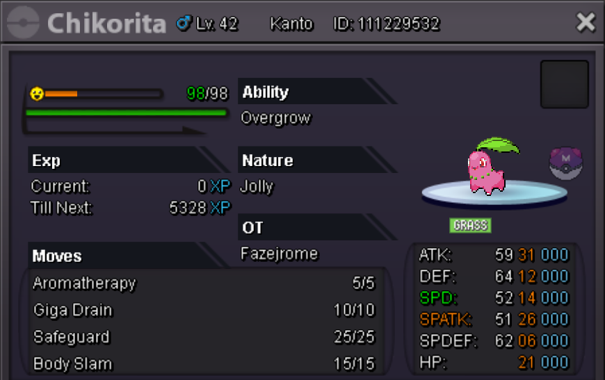 Details: Start Price : 3m Min Bid: 500k Insta: n/a End point: 48 hours after initial bid Accepted Payment: Pokedollars, Coin Capsules (x1 Coin Capsule = 500k) This is a cross server auction. You may bid from any server, if you are in gold a transfer will be made after winning the auction. You may place bids here or in game. The 15 Minute rule will go into effect if a bid is placed in the last 15 minutes