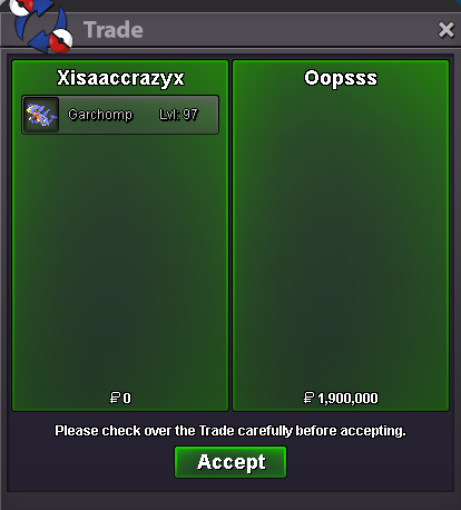What about to have a NPC that I can post my pokes and put the price for it? It can "take a %" as a service because the user opted to not use the chat for. Poke name filter and ability as it is the new box now (what was a great addition, kudos on that) Example: Pikachu | Static | lvl 20 | 50k Than you can click and see the poke details, buy or not. Maybe after a limit time, like 7 days, it comes back to your box to not flood the NPC list, also a limit posted pokes per account to avoid tons of poke with insane value from the same person.