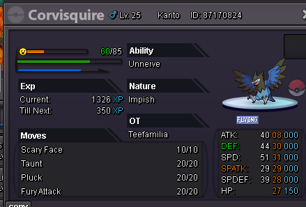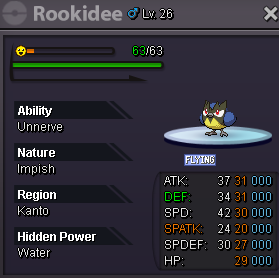 Gjj started following Impish Rookidee. ATK 31. DEF 31. SPD 30. SPDEF 27. HP 29.