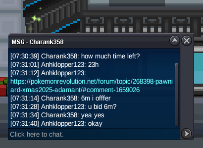 Auction Details Start Price: 1M End Point: 24 Hours (after start) End Time: TBA Insta Price: 4M Minimum Bid: 50K Accepted Payments: Pokedollars / 1x CC = 480K / 1x Nature RR = 300K / 1x IV RR = 700K Server Name: Gold Important Reminders This is a Gold Server auction. You may bid from any server but you must transfer to Gold Server upon winning the auction. If you intend to purchase with an alternate account or from other server, please specify the account name and/or server name alongside your bid. 15 minutes rule is applied. (If a bid is received in the final 15 minutes of the auction, the end point will be delayed by 15 minutes from that bid, and will be delayed by 15 minutes for each new bid thereafter, until the current offer has been held for a full 15 minutes) Please check the Trade Rules and Auction Rules if you are new to trading in PRO. Note: Please read all the rules and details carefully before placing your bid.