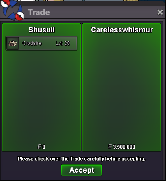 Start Offer: 300k Min Bid: 100k. Insta: 1.5m Duration: 24 hours after the first bid. Accepted payments : Reroll Ticket: 700k each. Nature Reroll: 350k each. Coin Capsule: 480k each. Pokedollars.