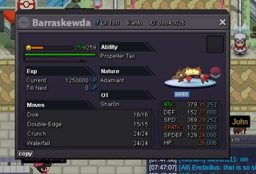 Auction Details: Start Price: 1m End Point: 48 hours (after start price is met) Insta Price: 10m Minimum Raise: 200k Accepted Payments: Pokedollars, Coin Capsules (x1 Coin Capsule = 500k), IV Reroll Tickets (x1 IV Reroll Ticket = 750k) Important Reminders: This is a Gold Server auction. If bidding from an alternative server, state that you will transfer upon winning. If you intend to purchase with an alt account, specify the account alongside your bid. If a bid is received in the final 15 minutes of the auction, the end point will be delayed by 15 minutes from that bid, and will be delayed by 15 minutes for each new bid thereafter, until the current offer has been held for a full 15 minutes.