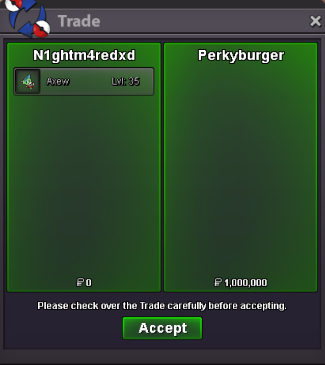 Auction Details Start Price: 2m End Point: 36 Hours (after start) Insta Price: 8m Minimum Raise: 100K Accepted Payments: Pokedollars Server Name: gold Important Reminders This is a Gold Server auction. You may bid from any server but you must transfer to Gold Server upon winning the auction. If you intend to purchase with an alternate account or from other server, please specify the account name and/or server name alongside your bid. 15 minutes rule is applied. (If a bid is received in the final 15 minutes of the auction, the end point will be delayed by 15 minutes from that bid, and will be delayed by 15 minutes for each new bid thereafter, until the current offer has been held for a full 15 minutes) Please check the Trade Rules and Auction Rules if you are new to trading in PRO