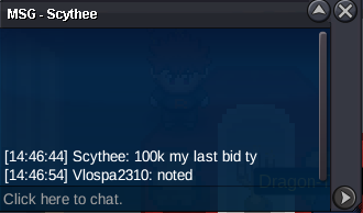 Start Point/Price: 1k End Point: 24 hours from the first bid Min. Raise: 1k Accepted Payment: Pokedollars, CC 500k RR 700k If a bid is received in the final 15 minutes of the auction, the end point will be delayed by 15 minutes from that bid, and will be delayed by 15 minutes for each new bid thereafter, until the current offer has been held for a full 15 minutes.