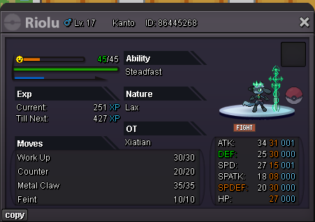 Xiatian started following HLW Riolu 31ATK 30DEF