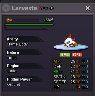 AUCTION Timid 31/28 HP Ground Larvesta - S.O. 100k Min. Bid. 100k Insta: N/A Auction starts: 01/01/26 08:24pm gmt+3 Auction ends: 03/01/26 08:24pm gmt+3 Ends 48h after the first bid. Timid Contrary Semi-Epic HP Fire Snivy - S.O. 100k Min. Bid. 100k Insta: N/A Auction starts: Auction ends: Ends 48h after the first bid. Acceptable methods of payment: Cash CC - 500k RR - 750k
