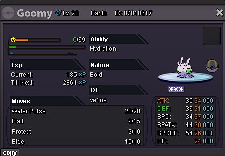 Sup Trainers, im putting on auction this beautiful Tank Goomy (Tankoomy) starting Price 900k Min. raise 50k. "Why should i bid on this goomy?" You may ask yourself, and well, the reasons are pretty clear: This Goomy has excellent IVS on every single stat and a Nature made to be Tanky (+DEF -ATK) The ability "Hydration" makes this Goomy synergize with Your standard Meta Rain PVP Team Talking about Rain PVP Teams ... if you're not an enjoyer yourself of these types of team taking this goomy and implementing it in your team would be a great choice, let me explain you why: Goomy's strong point, other than it being a Special Atker, is that he's extremely versatile This Tanky Nature and His natural Special Moveset Pool makes it a natural to tank Physical Attackers (such as Bisharp/Kingambit) other than being unpredictable to the enemy PVPer His ability benefits, in case the enemy is using a Rain Team, from the rain setted up making it impossible to give status condition(paralisys,poison,sleep etc) to this tanky pokemon. Auction starts on the first Bid and ends 72hrs later. This auction obviously follows the 15 minute rule (If the auction is ending and there's a bid last minute, the auction will keep going for 15 more minutes in order to give people chance to counter-bid)