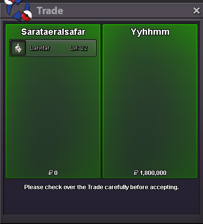 Auction Details Start Price: 1 Mil End Point: 48 Hours (after first bid) Insta Price: no insta Minimum Raise: 100k Accepted Payments: Pokedollars Server Name: Gold