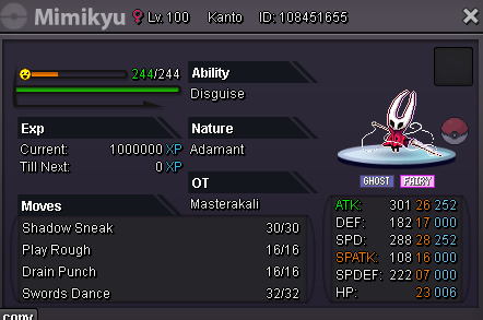 Ends 24 hrs of starting bid S.O 12m Min Bid: 200k ACCEPTED PAYMENTS: Pokedollars Reroll Ticket (700k ea) Nature Reroll (350k ea) Capsule Coins: (450k) Rules: Please include the account name you will be using for the transaction if you are not purchasing with your main account. 15 Minute Rule: If a bid is received in the final 15 minutes of the auction, the end point will be delayed by 15 minutes from that bid. This delay will repeat with each new bid until the current offer has stood for a full 15 minutes. (Insta 25m)