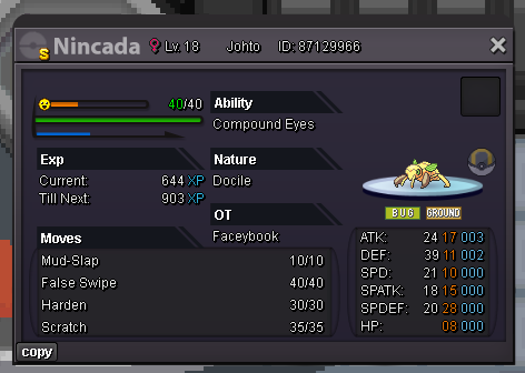 Note: Upon evolution, this shiny yields both a Shiny Ninjask and a Shiny Shedinja, making it a two-in-one shiny. Auction Details: Start Price: 5m End Point: 48 hours (after start price is met) Insta Price: N/A Minimum Raise: 200k Accepted Payments: Pokedollars, Coin Capsules (x1 Coin Capsule = 500k), IV Reroll Tickets (x1 IV Reroll Ticket = 700k) Important Reminders: This is a Cross Server auction. You may bid from any server, and I will transfer to your preferred server upon winning. If you intend to purchase with an alt account, specify the account alongside your bid. If a bid is received in the final 15 minutes of the auction, the end point will be delayed by 15 minutes from that bid, and will be delayed by 15 minutes for each new bid thereafter, until the current offer has been held for a full 15 minutes. Happy Bidding!