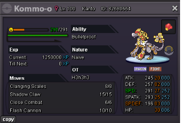 Volcarona epic ivs : Hp rock to counter match up volca vs volca S.o : 500k - minimum bid: 50k -----> auction end 3 days after first bid Muk-alolan poison touch : S.o : 400k - minimum bid: 50k -----> auction end 3 days after first bid kommo-o : Naive bulletproof pvp ready S.o : 300k - minimum bid: 50k -----> auction end 3 days after first bid Naive mega loppuny 31 speed : S.o : 300k - minimum bid: 50k -----> auction end 3 days after first bid Blacephalon choice scarf mode : S.o : 300k - minimum bid: 50k -----> auction end 3 days after first bid Special Pink Parasect dry skin ability : false sweep+spore S.o : 400k - minimum bid: 50k -----> auction end 3 days after first bid I accepte payment : - money - cc = 500k -reroll tickets 750k enjoy