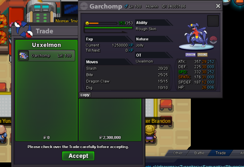 Auction Details : Start Price: 1m End Point: 48 Hours (after start) Insta Price: NA Minimum Raise: 100k Accepted Payments: Pokedollars , cc= 500k Server Name: gold Important Reminders This is a Gold Server auction. You may bid from any server but you must transfer to Gold Server upon winning the auction. If you intend to purchase with an alternate account or from other server, please specify the account name and/or server name alongside your bid. 15 minutes rule is applied. (If a bid is received in the final 15 minutes of the auction, the end point will be delayed by 15 minutes from that bid, and will be delayed by 15 minutes for each new bid thereafter, until the current offer has been held for a full 15 minutes) Please check the Trade Rules and Auction Rules if you are new to trading in PRO