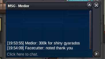 Start price 10m Min bid 500 k End point: 48 hours after initial bid Accepted Payment: Pokedollars, Coin Capsules (x1 Coin Capsule = 480k) This is a silver Server auction. You may bid from any server but you must transfer to silver Server upon winning the auction. You may place bids here or in game. The 15 Minute rule will go into effect if a bid is placed in the last 15 minutes