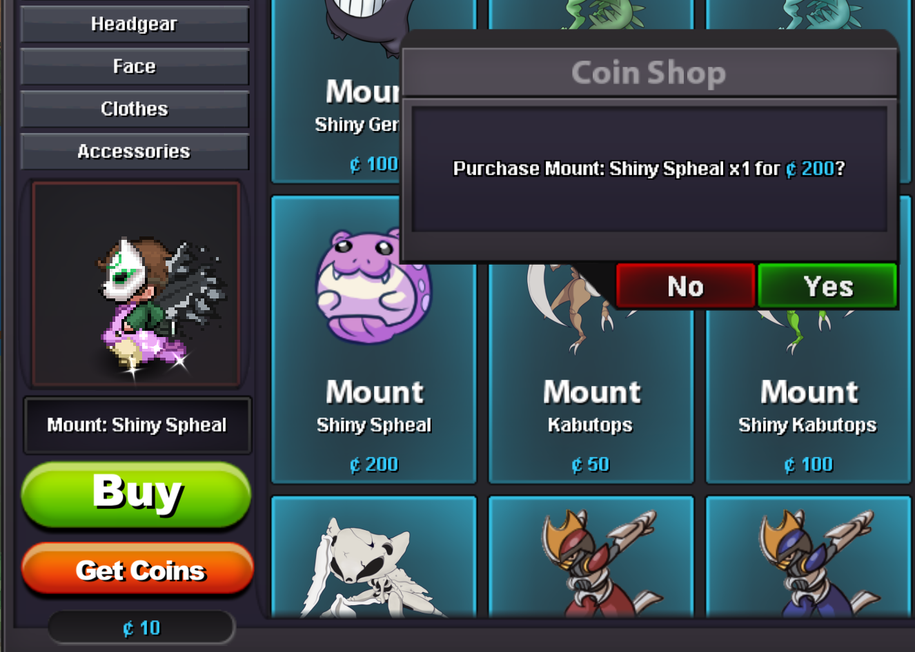 When i look at the shop, it says its 200 coins for the shiny spheal mount. I asked some others, and it was 200 for some but only 100 for the rest. I assume it is a bug, even when I go to buy it's 200