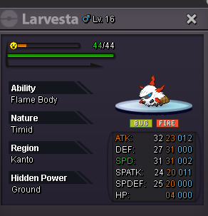 Naatch started following Larvesta 31 spd 31 def 20+ (except hp) HP ground