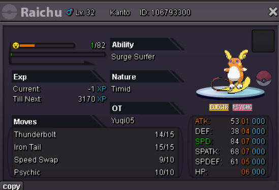 Starting Bid: 100k min bid: 20k Accepted Payments: Pokedollars CCs @ 500k each IV Rerolls @ 750k each No Insta Price Auction Duration: 48 hours (after starting bid is met) Rules: This is a Silver Server auction. If you’re on Gold, you must transfer to Silver upon winning. Please include the account name you will be using for the transaction if it’s not your main. 15-Minute Rule: If a bid is placed within the last 15 minutes of the auction, the end time will extend by 15 minutes from that bid. This continues until the final offer stands for a full 15 minutes.