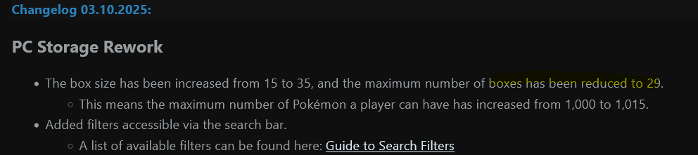 Title: Storage Limit Bug + bad visual indication Game Version: Halloween 25 v2 Edition Description: While catching an event form Pokémon - un/-lucky :D, I received a message saying my storage was full — even though I was sure I still had around 1.5 boxes free. Details: My storage shows 30 boxes in total. Box 29 is only half filled, and Box 30 is completely empty. According to the latest changelog, the maximum Pokémon capacity has been increased to 1015, which should equal 29 full boxes (35 slots each). The game, however, incorrectly treated my storage as full. The Box 29 display appears half full, and Box 30 seems to be just a visual placeholder, which is misleading. Expected behavior: The game should correctly recognize the available space according to the updated 1015-slot limit and not trigger the “storage full” message when slots remain. While Box 30 should be hidden, if not available Additional evidence: 1) Hunting encounter screenshots: 2) A Screenshot is attached showing Box 29 only half full and Box 30 appearing empty. 3) The corresponding change log extract: Further suggestions: Mail/Lend overflow mechanic to be (partially) adopted to wild encounters or some warning msg like - "Only x slots left in storage"